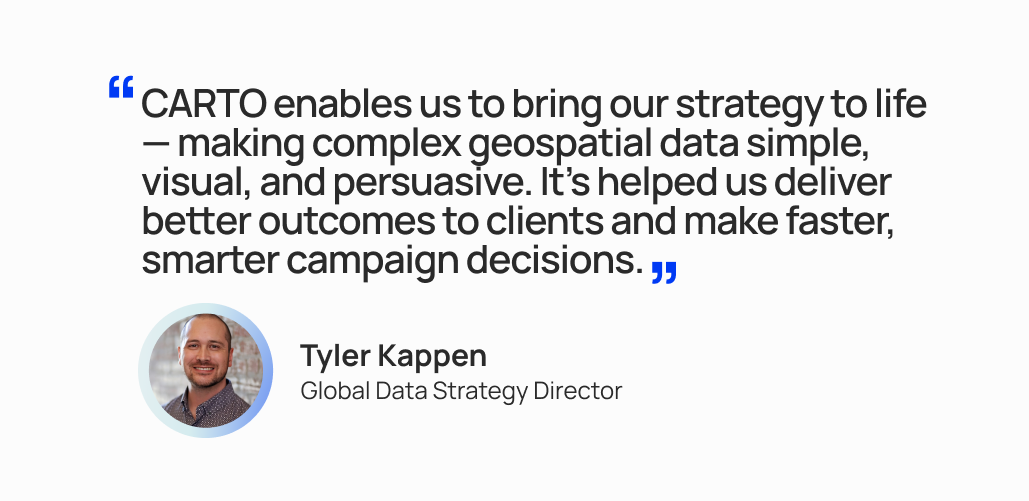 By integrating CARTO’s location intelligence platform across our global operations, we’ve centralized spatial analytics and made complex data actionable. With intuitive, scalable analytics and mapping capabilities, our teams quickly translate data into strategy — enabling smarter decisions, faster turnarounds, and richer storytelling across every campaign.