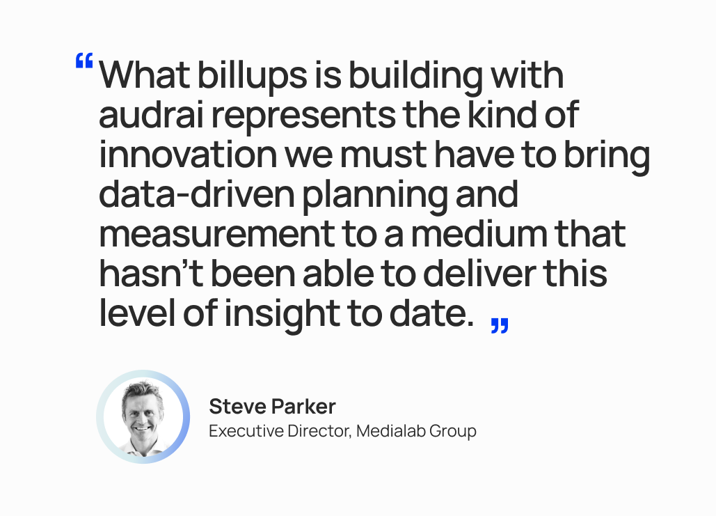 “As an agency with a relentless focus on marketing effectiveness, we need a greater level of accountability and agility from Out-of-Home so we can measure and prove its impact on both brand and commercial KPIs,” said Steve Parker, Executive Director at Medialab Group. “What billups is building with audrai represents the kind of innovation we must have to bring data-driven planning and measurement to a medium that hasn’t been able to deliver this level of insight to date. We are excited to be early partners in this transformation and to help push the industry forward to how the medium should be planned and measured in the modern era.”