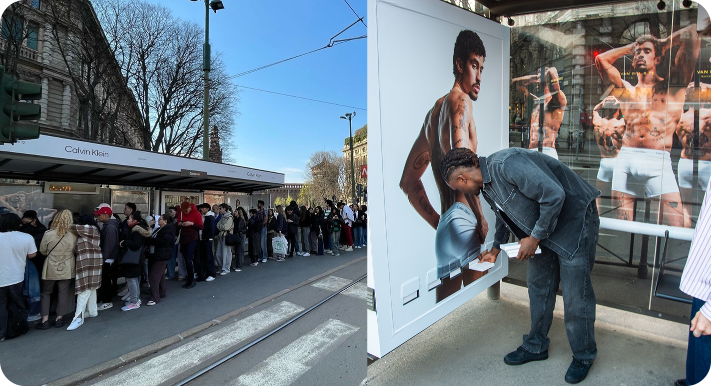 The creative centrepiece was a bespoke bus shelter takeover at Largo Cairoli, Milan. Featuring a branded dispenser offering limited-edition Calvin Klein boxes redeemable in-store for gifts, it turned OOH into an interactive, physical brand touchpoint. Over just one week: